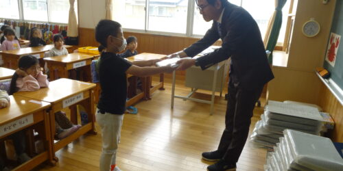 4月13日(月)、タブレット貸与式を行いました 1年生教室では、校長先生が代表児童にタブレットを渡しました。「遊びではな...