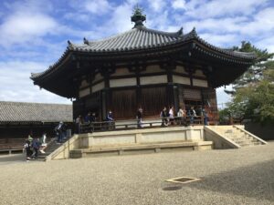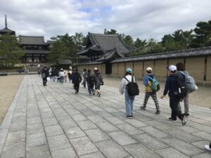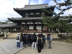 最初の目的地である「法隆寺」に到着しました。世界最古の木造建築群として知られる西院伽藍と夢殿を中心とした建築群である東院伽藍の両方を見学しました。大宝蔵殿には、夢違観音や玉虫厨子、百済観音像が展示されていました。観音様は、とても優しいお顔をしていらっしゃいました。