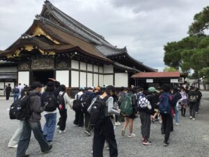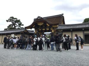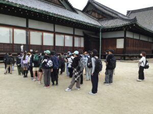 二条城の立派な門をくぐり、お城の中を見学しました。床には、人の侵入を知らせる「うぐいすばり」という仕掛けがしてありました。たくさんある部屋にはそれぞれ役割があり、襖や壁、天井に美しい絵が描かれていました。ここ「二条城」で、第15代将軍の徳川慶喜が大政奉還の意思を表明し、200年以上続いた江戸幕府の終わりを告げました。実際に見ることで、歴史の流れを感じることができました。