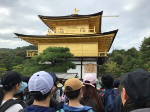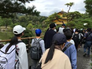 室町幕府第3代将軍の足利義満が有力な守護大名を討伐、南北朝を統一し、幕府の力の象徴として、金閣寺を建立しました。大きな池のほとりで、黄金に光り輝く「金閣寺」を見て、その美しさに心動かされる子どもたちでした。グループごとに、金閣寺をバックに記念写真を撮りました。