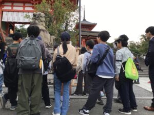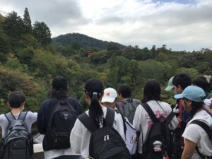 駐車場からおみやげ屋さんが並ぶ通りを抜けると、清水寺が姿を現しました。国宝の本堂から張り出した「舞台」は高さ13メートル。樹齢400年以上のけやきを使った構造で支えられており、くぎを1本も使用していません。この「舞台」から見える古都「京都」の景色に感動している子どもたちでした。