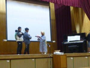 総合的な学習の時間に学んできた防災学習について、「浦島太郎」の劇を通して伝えました。おうちの方々にも防災について考えるきっかけにしてほしいとも思い発表しました。