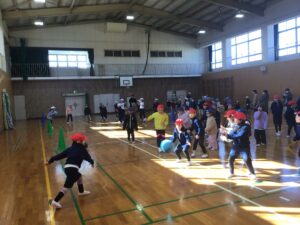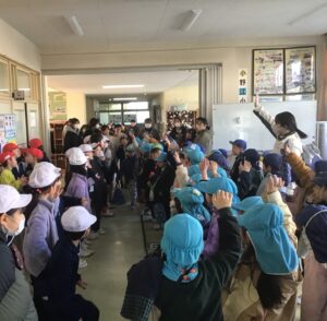 2月19日(木)、三雲北こども園の年長組の園児たちが1年生の学習の様子を見に来てくれました。国語の学習では、背筋を伸ばし、しっかりとお話を聞く姿や手を挙げて発表する姿を見てもらい、とても誇らしげな表情でした。その後、校歌や「1年生になってできるようになったこと」を発表し、最後にみんなでドッジボールをして楽しみました。子どもたちは「ちょっと緊張したな。」と話しながら、園のみんなに「かわいいね。」「4月から待ってるよ。」と優しく声をかけていました。