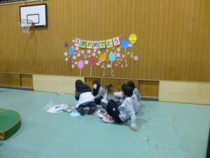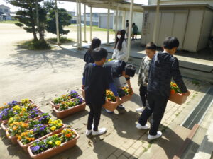 4月3日(金)、新6年生が入学式の準備のために登校し、会場設営や1年生教室の環境づくりに取り組みました。